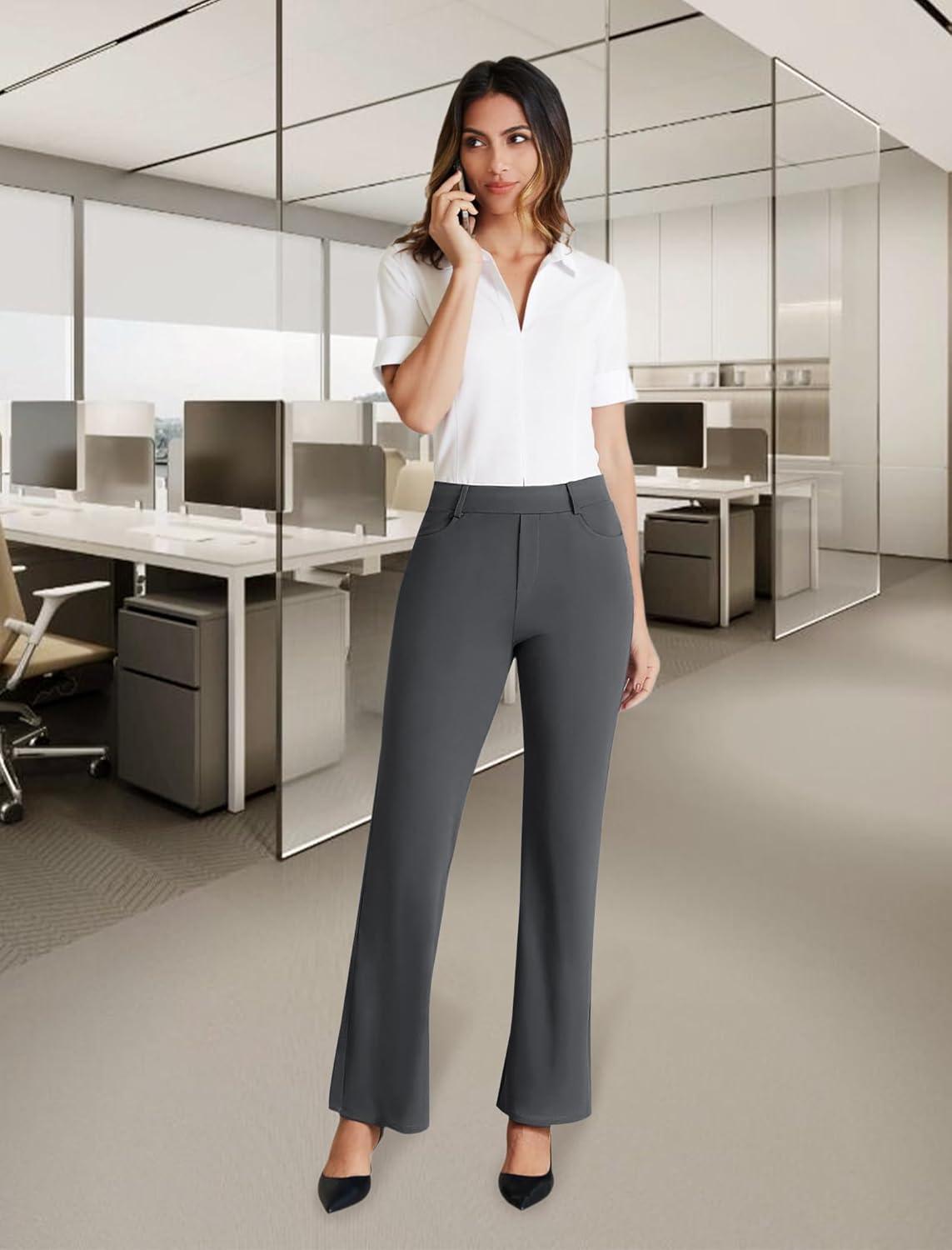 Dress Work Pants Women Business Casual Slack Trousers Stretchy Pull On Office Flare Pants with Pockets(Deep Grey)