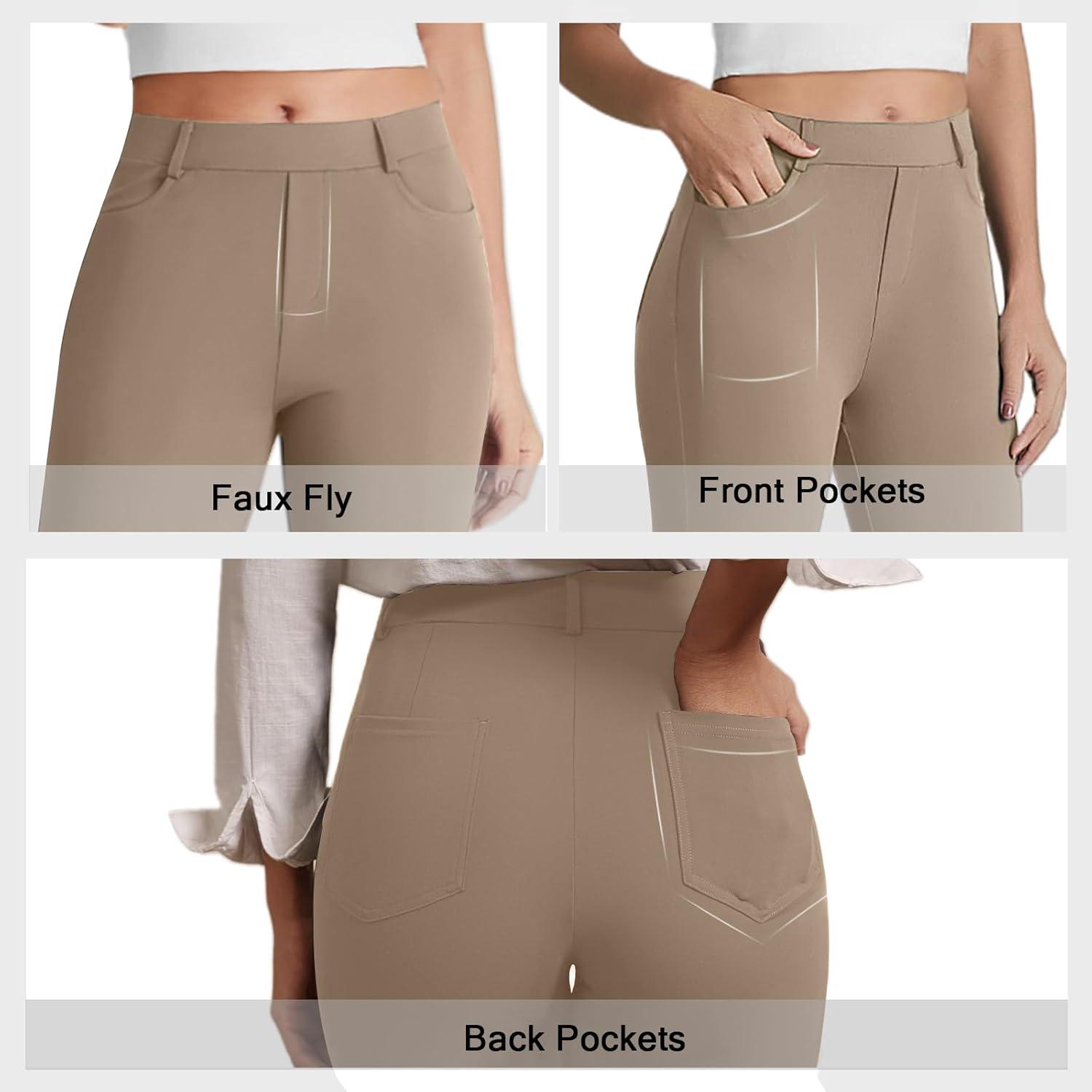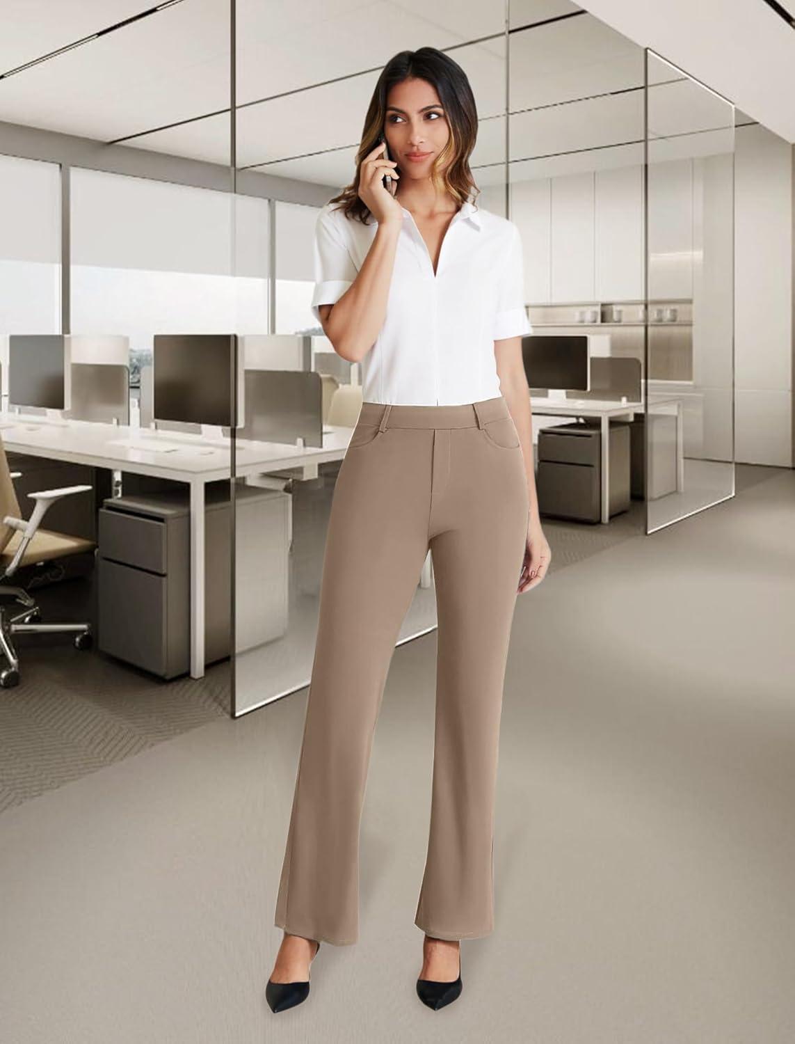 Dress Work Pants Women Business Casual Slack Trousers Stretchy Pull On Office Flare Pants with Pockets(Deep Khaki Coffee)