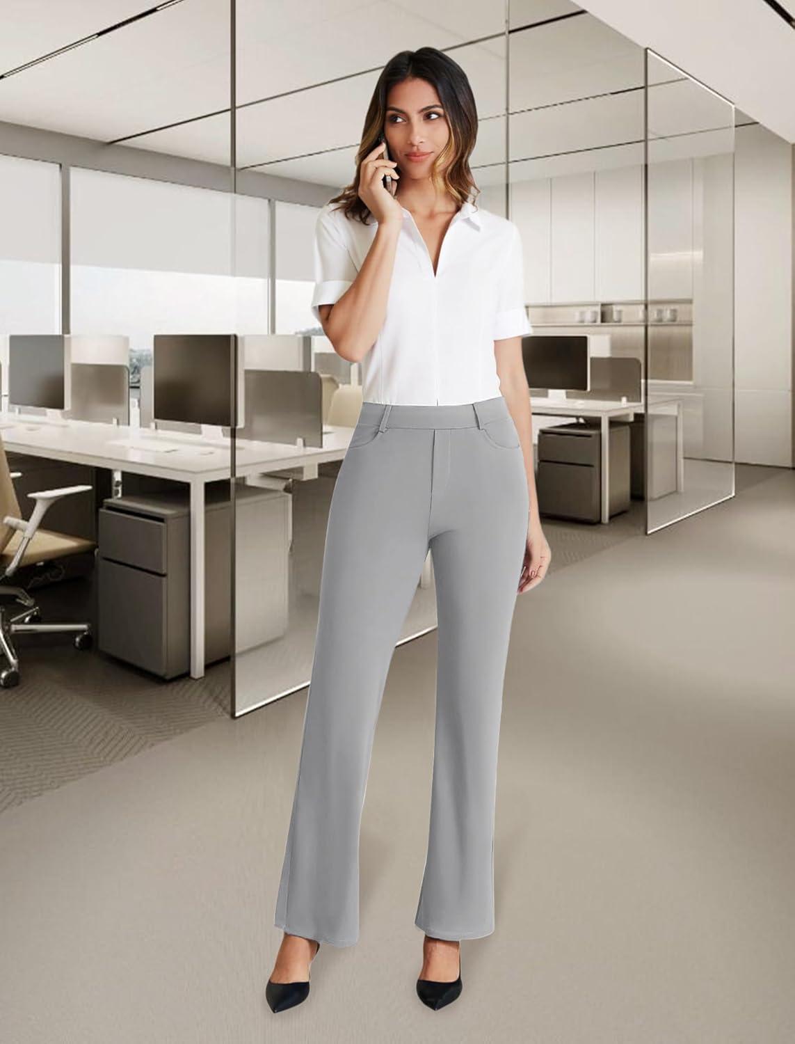 Dress Work Pants Women Business Casual Slack Trousers Stretchy Pull On Office Flare Pants with Pockets(Grey)