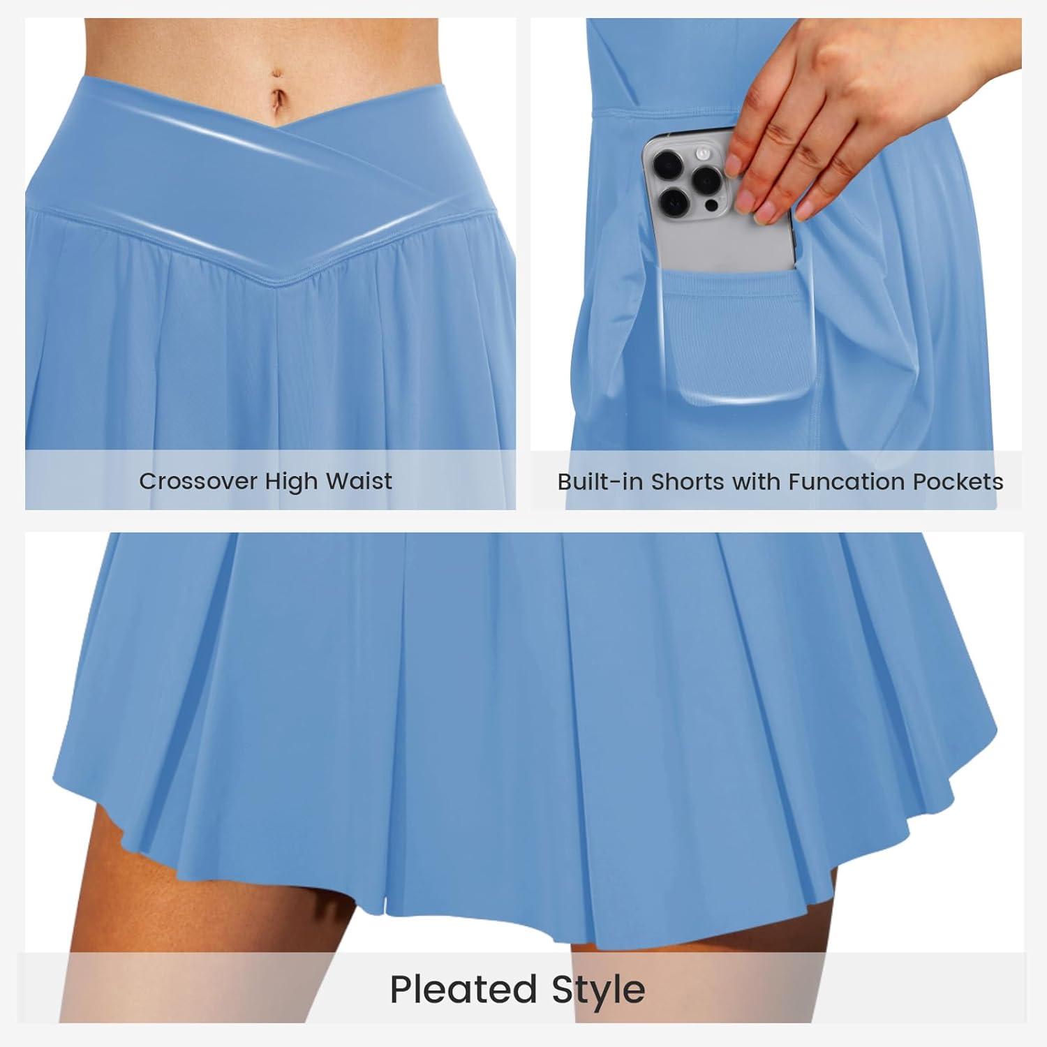 Pleated Skirts for Women High Waisted Tennis Golf Skirt with Shorts Pockets Athletic Pickleball Mini Skort(Crossover-sky Blue)