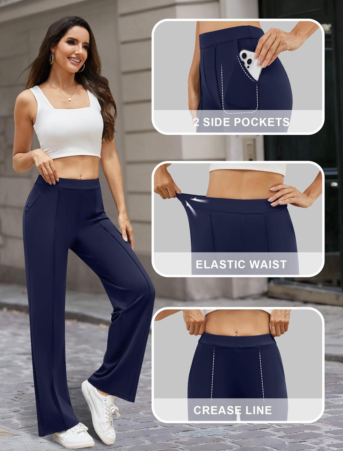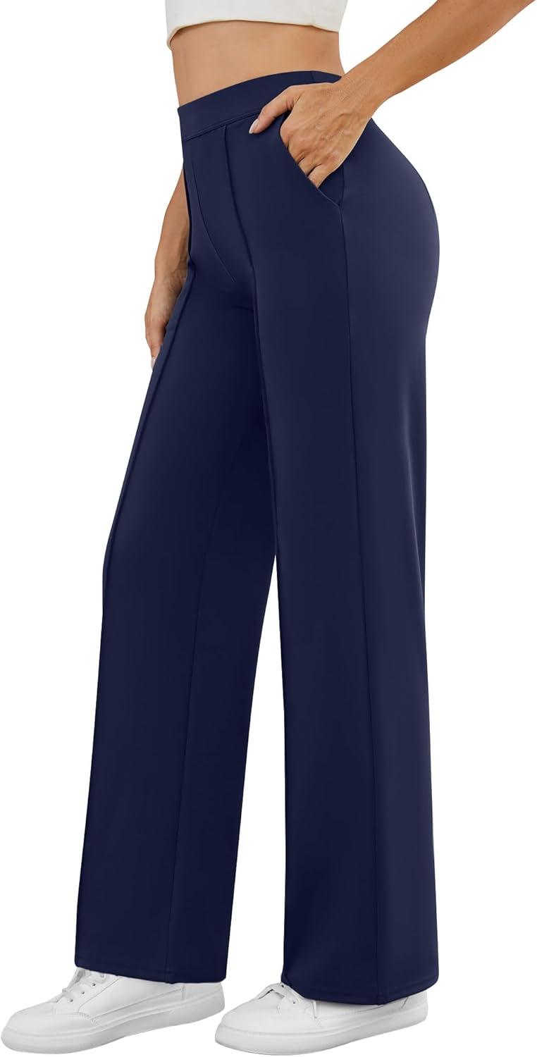 Womens Dress Work Pants Business Casual Slacks Stretchy Wide Leg Trousers with Pockets High Waist Pull On(Navy Blue)