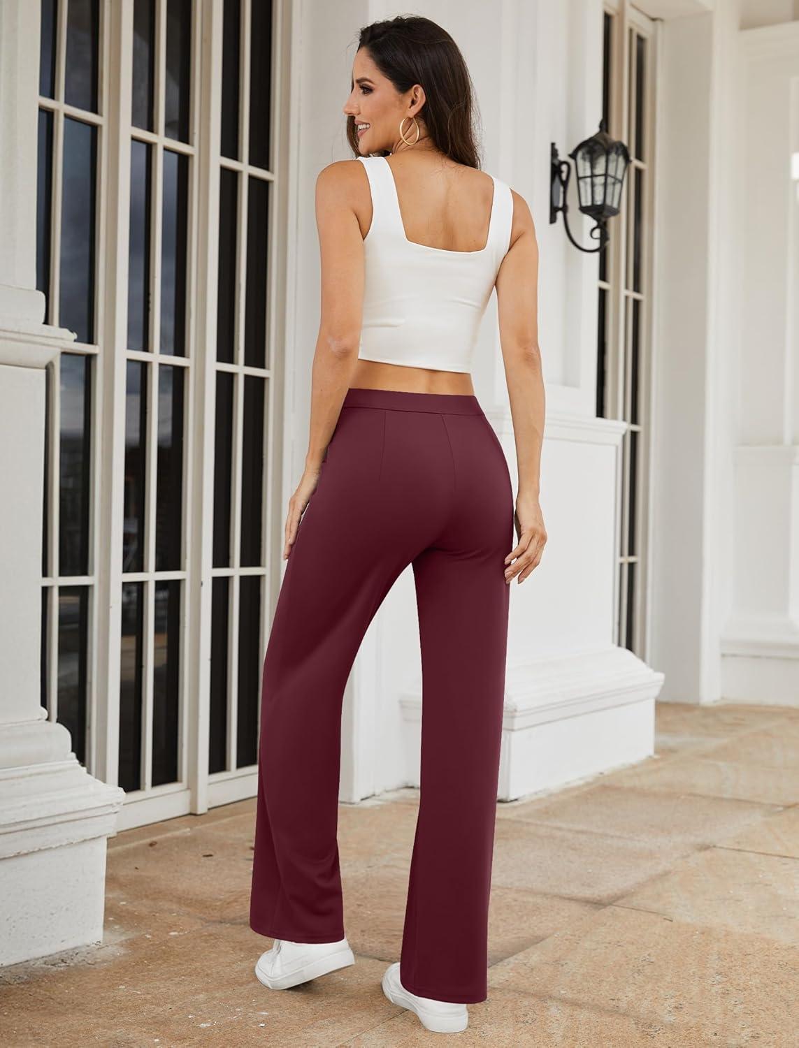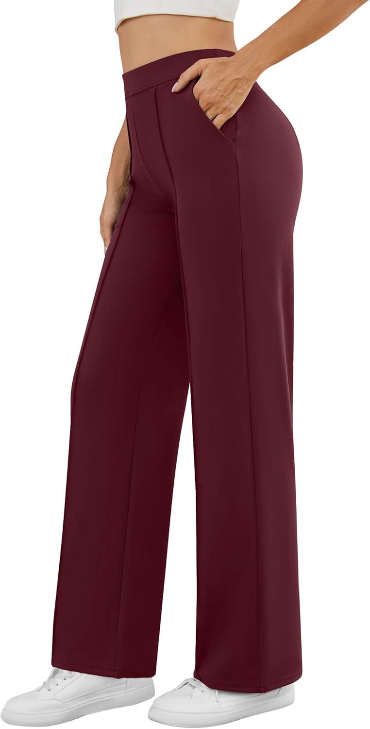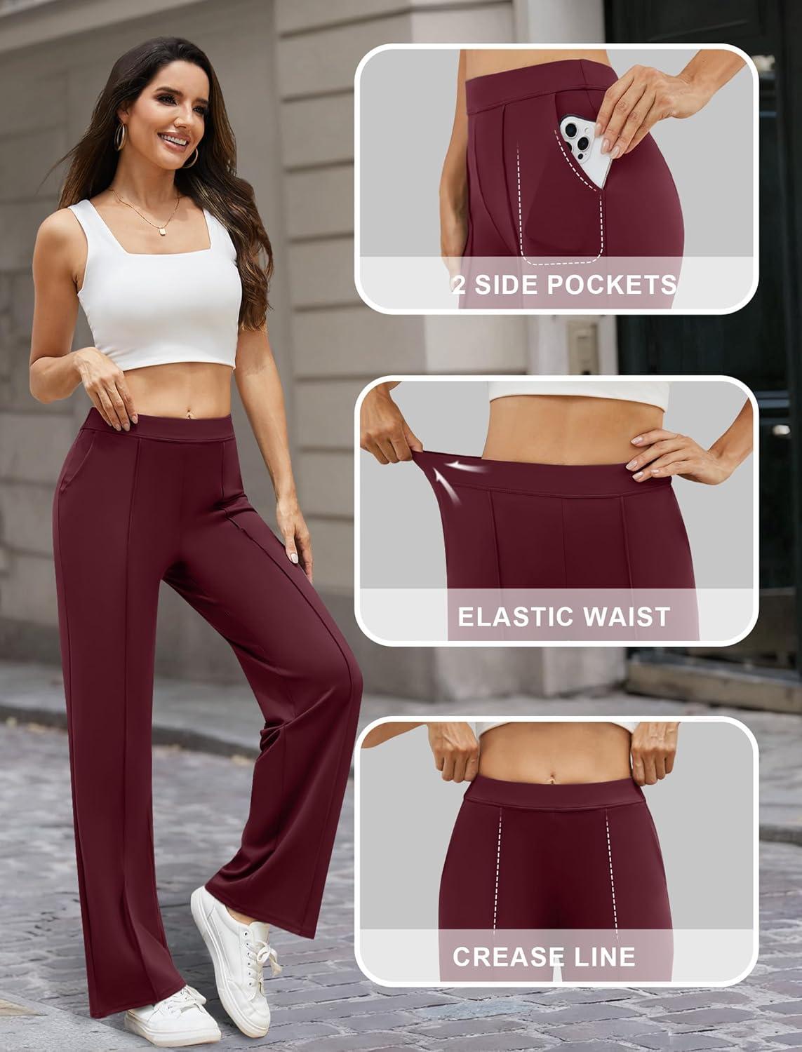 Womens Dress Work Pants Business Casual Slacks Stretchy Wide Leg Trousers with Pockets High Waist Pull On(Wine Red)