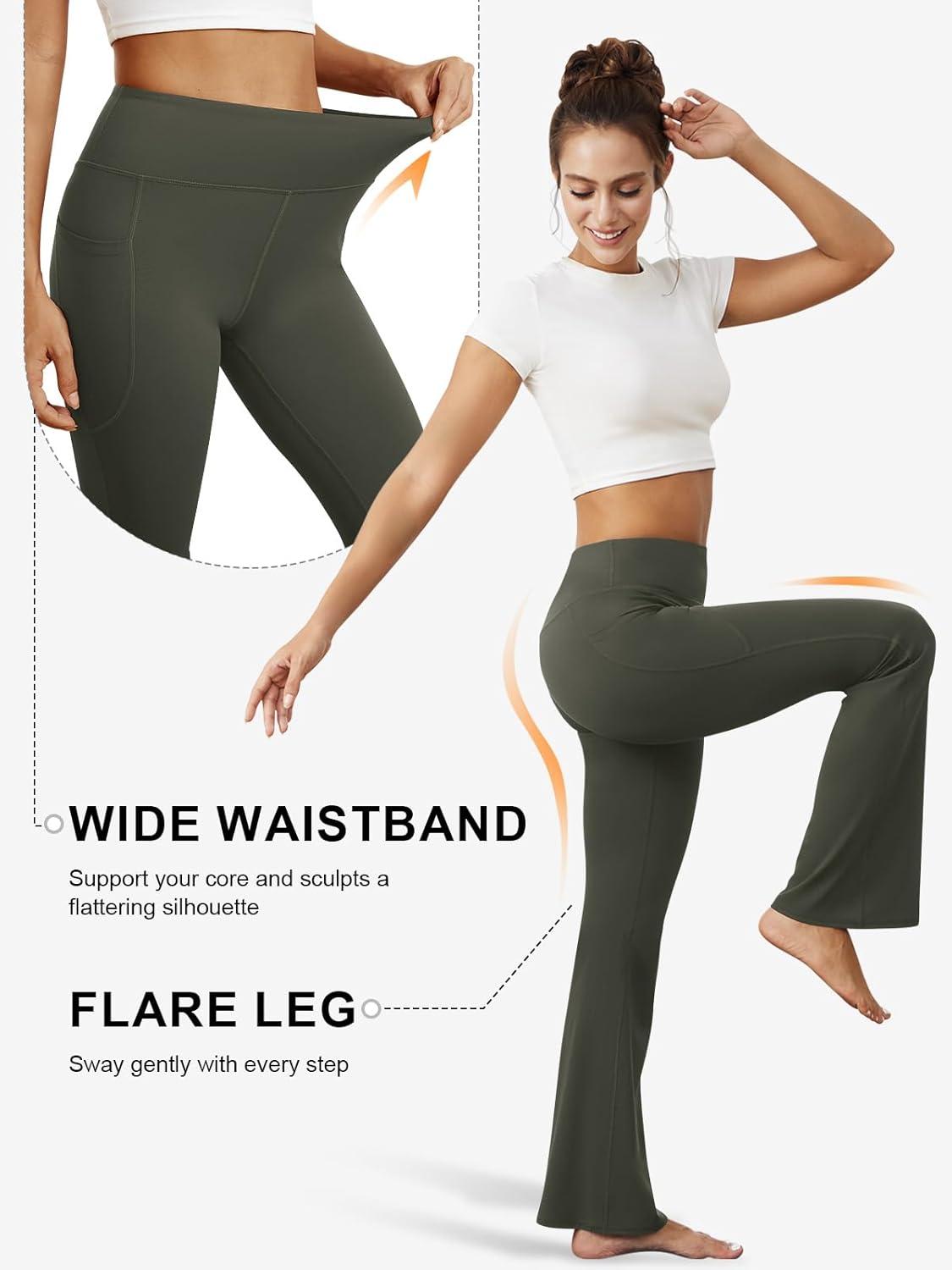 imageWomens Flare Yoga Pants with Pockets High Waist Tummy Control Flared Leggings Bell Bottom Gym Workout LeggingsArmy Green