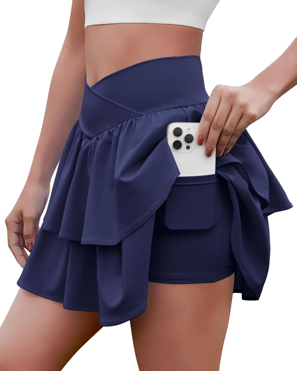 Women’s Ruffle Tennis Skirt with Shorts Pockets Athletic Crossover Layered Skorts Golf Running(Navy Blue)