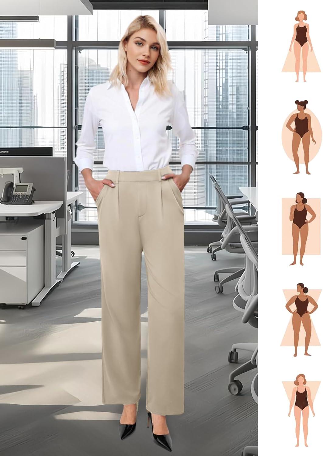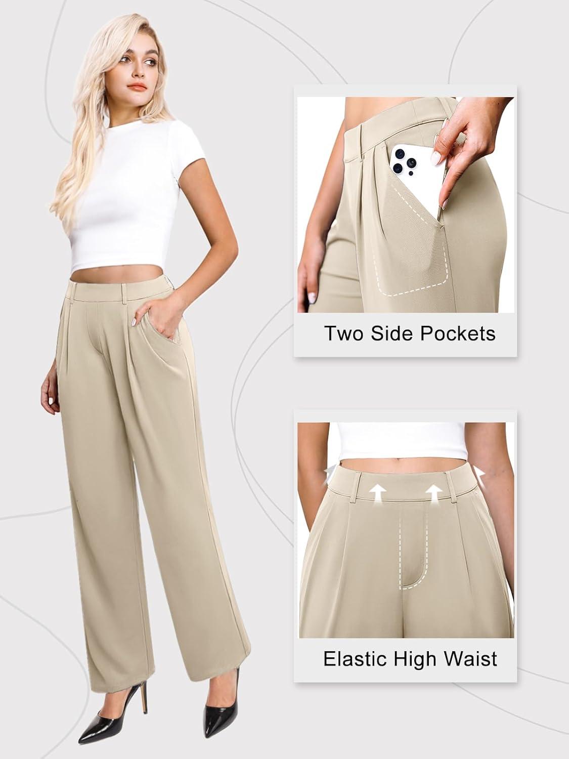 Womens Wide Leg Dress Pants Stretchy High Waisted Work Pants Business Casual Office Trousers with Pockets(Khaki)