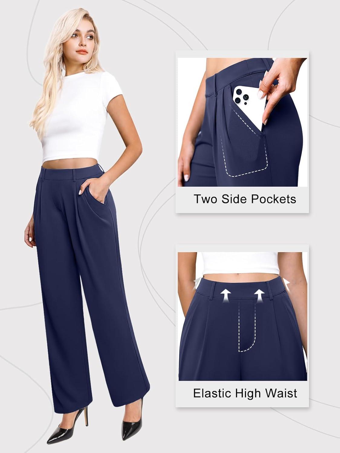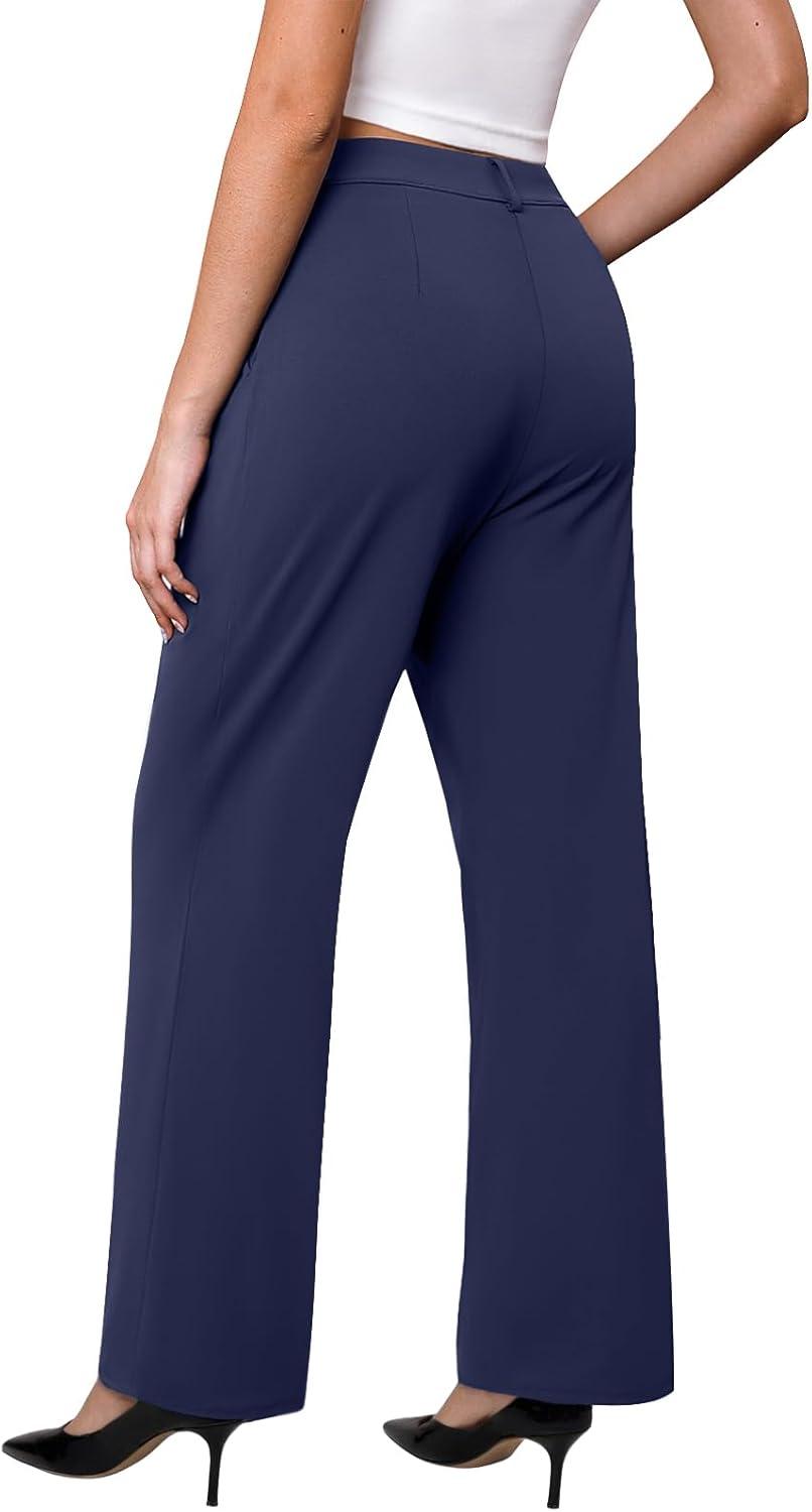 Womens Wide Leg Dress Pants Stretchy High Waisted Work Pants Business Casual Office Trousers with Pockets(Navy Blue)